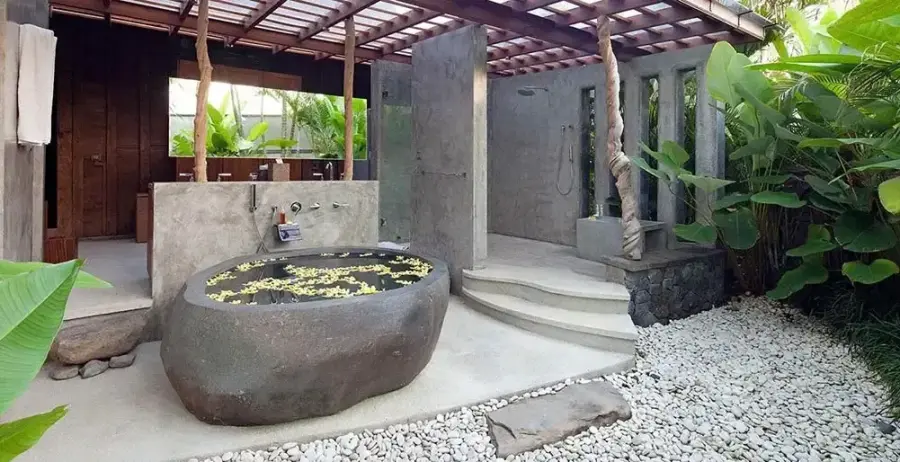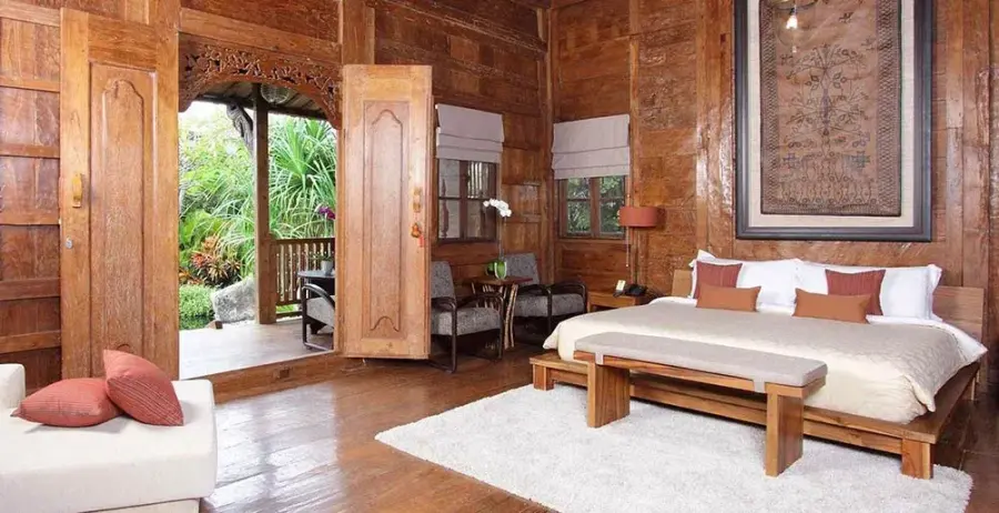 dengan Sentuhan Warisan Budaya Interior vila dihiasi dengan koleksi antik pilihan dan detail arsitektur yang menakjubkan. Kamar tidur utama dilengkapi tempat tidur king-size dengan seprai berkualitas tinggi, kamar mandi semi outdoor dengan bathtub terrazo, dan teras pribadi menghadap kolam renang. Dapur gourmet modern dan ruang santai outdoor yang nyaman menciptakan suasana hangat namun mewah. Kolam renang berbentuk laguna dengan air terjun memberikan sentuhan magis pada landscape vila.